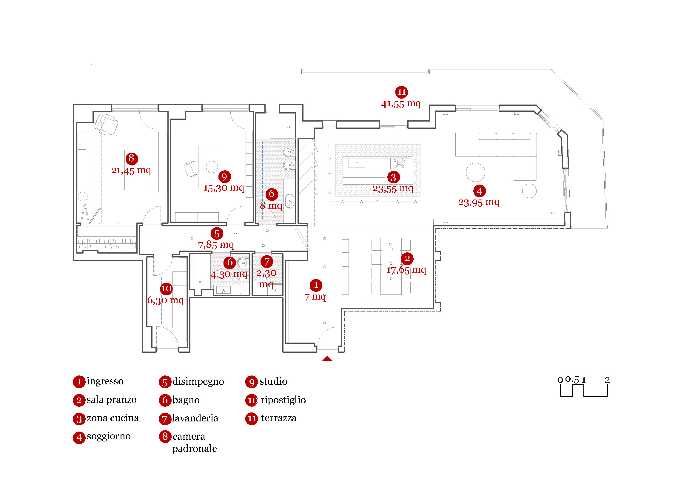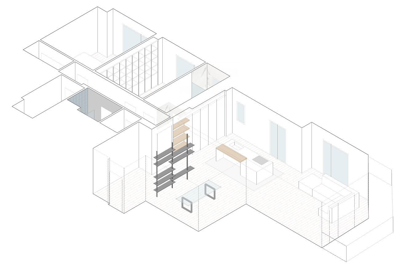 Il volere del committente era quello di trasmettere luce ed ariosità ad un appartamento che in origine invece era partizionato in più stanze secondo lo schema più diffuso dall’edilizia degli anni ’70 con stanze collegate da un corridoio. Pertanto si è optato per la creazione di uno spazio domestico aperto contenente tutte le funzioni distributive principali del vivere quotidiano.