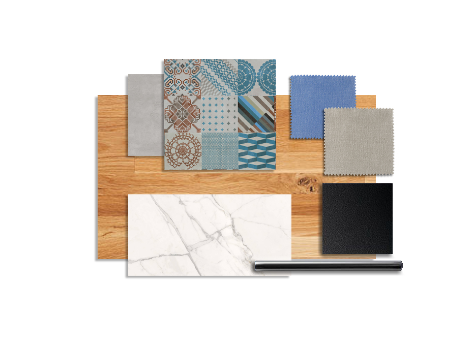 Il secondo bagno, dedicato agli ospiti, è stilisticamente differente, con palette cromatica alternativa caratterizzata da sanitari in colore ardesia, rivestimento doccia e pavimento con piastrelle in composizione mista stile patchwork dai motivi geometrici e floreali della tradizione rivisitati in chiave contemporanea. Sulle altre pareti è stata applicata una resina cementizia di colore grigio altamente idrorepellente e con effetto di finitura materico. La zona lavabo è costituita da un grande elemento in corian con vasca incassata, e soprastante specchio esteso sull’intera parete. La zona doccia in nicchia, anche qui con piatto filo pavimento e vetro divisorio è illuminata da una decorativa luce a led a cascata, nascosta nel soffitto.