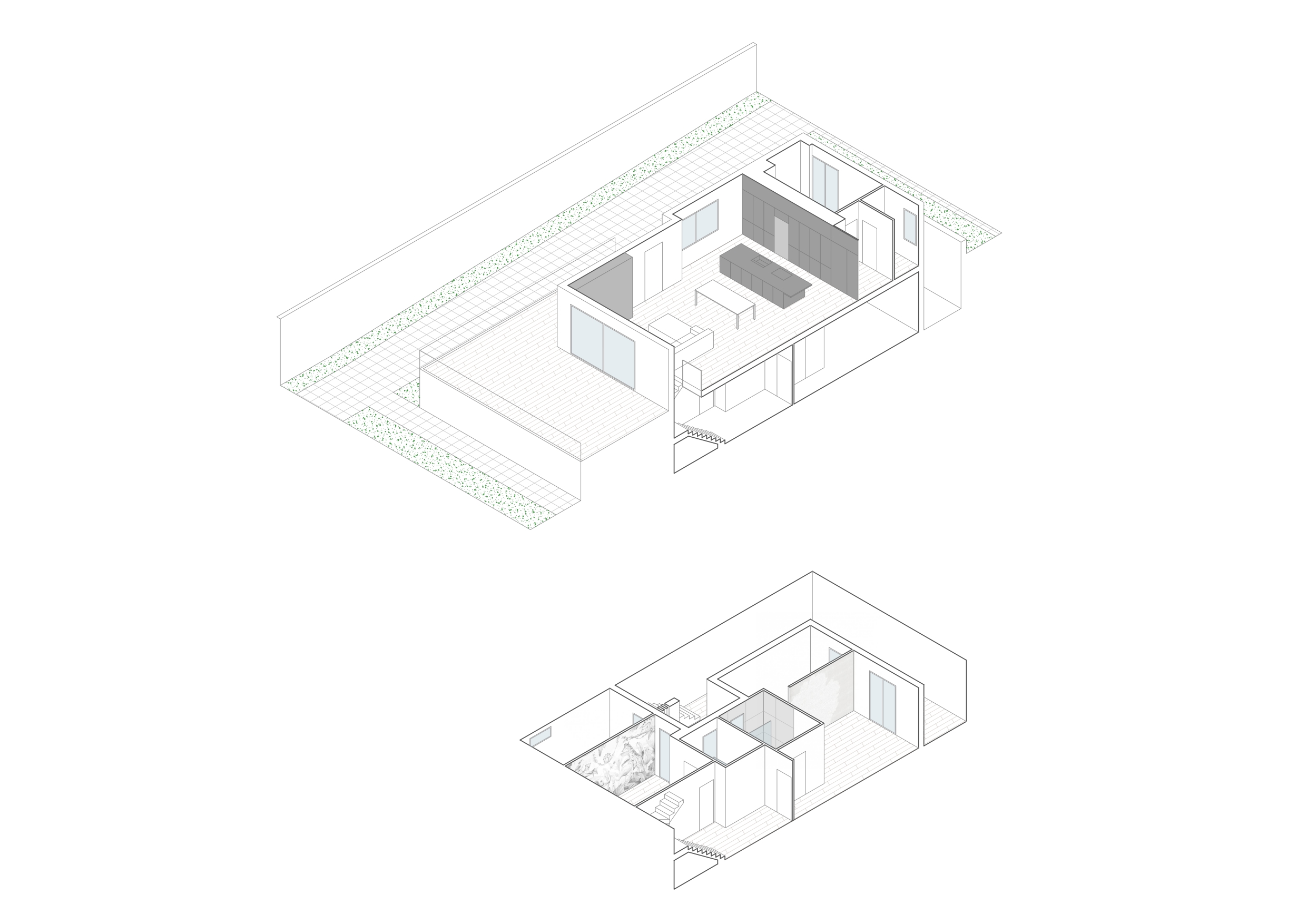 La ristrutturazione ha coinvolto l’intera struttura, mirando a espandere gli spazi abitativi e adottando un approccio contemporaneo nel design degli ambienti. L’attenzione è stata focalizzata sull’ottimizzazione dello spazio interno, attraverso il trasferimento dei paramenti murari verso l’esterno e l’incorporazione del portico esistente. Questa strategia ha consentito un aumento significativo delle superfici interne, consentendo una distinzione chiara tra le funzioni dei due livelli dell’edificio.
